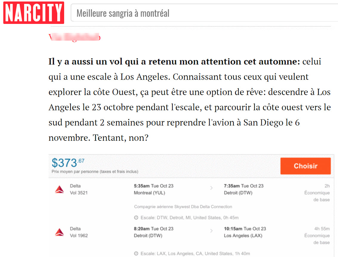 L'exemple donné dans cet article parle d'un vol aller-retour pour San Diego avec escale à Los Angeles et l'auteure nous dit que vous pouvez tout simplement débarquer lors de cette escale puis reprendre les vols du retour de San Diego. Une très grosse erreur de sa part car si vous faites cela, les vols de retour pour Montréal de San Diego seront tous annulés par la compagnie aérienne puisque vous n'aurez pas respecté l’itinéraire sur votre billet.