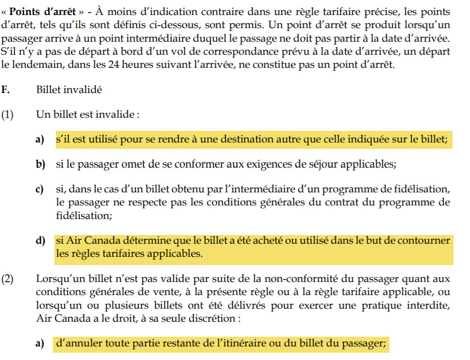 Capture d'écran des termes et conditions d'Air Canada concernant la règle tarifaire