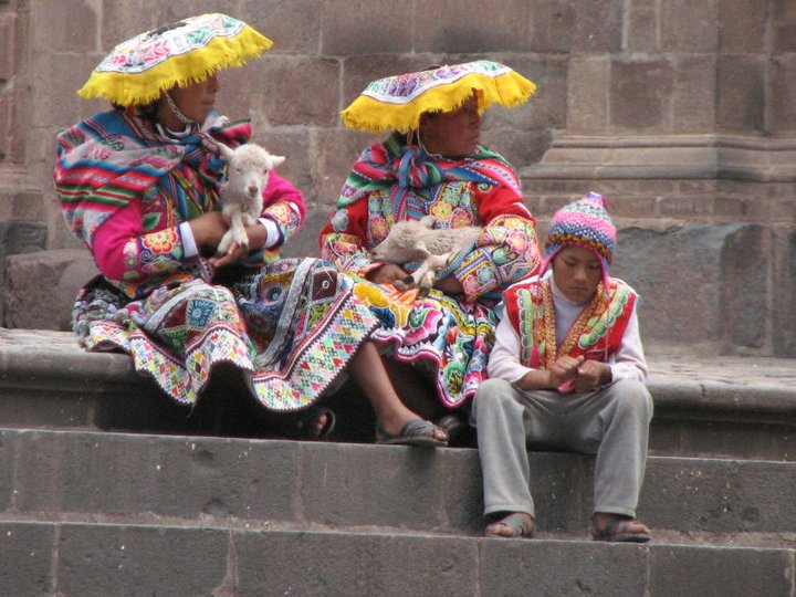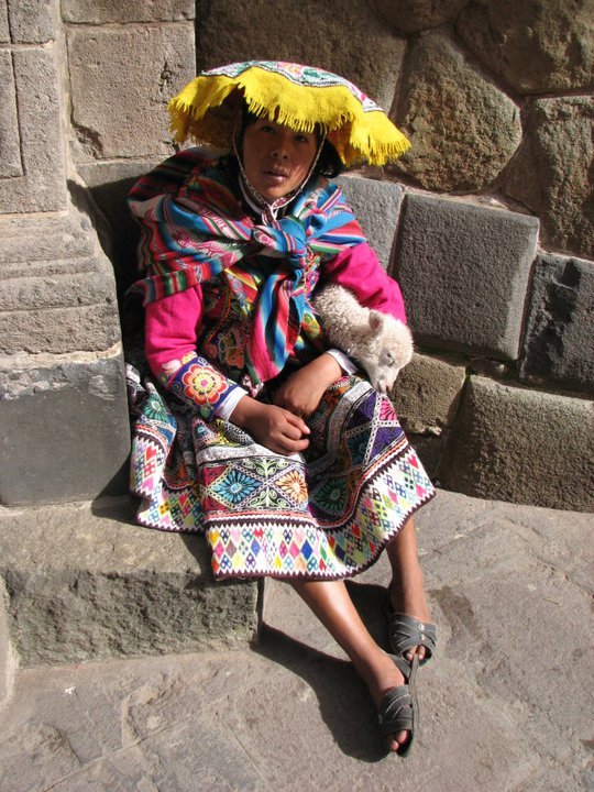 Si jamais vous n’avez pas remarqué, le costume traditionnel change avec les régions. Petit rappel : La vallée de Colca, avec toutes ses broderies, les chapeaux surchargés de broderies. Puno : les jupes plus évasées et parfois plus courtes mais surtout l’espèce de petit chapeau melon qui doit être assurément broché sur la tête avec des centaines de bobs épines! Uros les îles flottantes : jupes et haut unis avec des couleurs très très vives, avec des pompons dans les cheveux. Ici à Cuzco, ils portent une espèce de chapeau avec un napperon avec des franges sur la tête. C’est magnifique, ils sont tous beaux !!